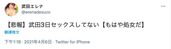 因为她发文的内容实在很猛,大家可以看看她昨天发了什么ー没有宣传自己解禁肛肛好的作品,而是悲伤地宣布自己3天没爱爱了ー没错,人家冲人气是放美美的照片开直播聊天,武田エレナ(武田绘玲奈)是每天和大家报告自己做了什么,像4月2日她就说自己自慰了4次〜