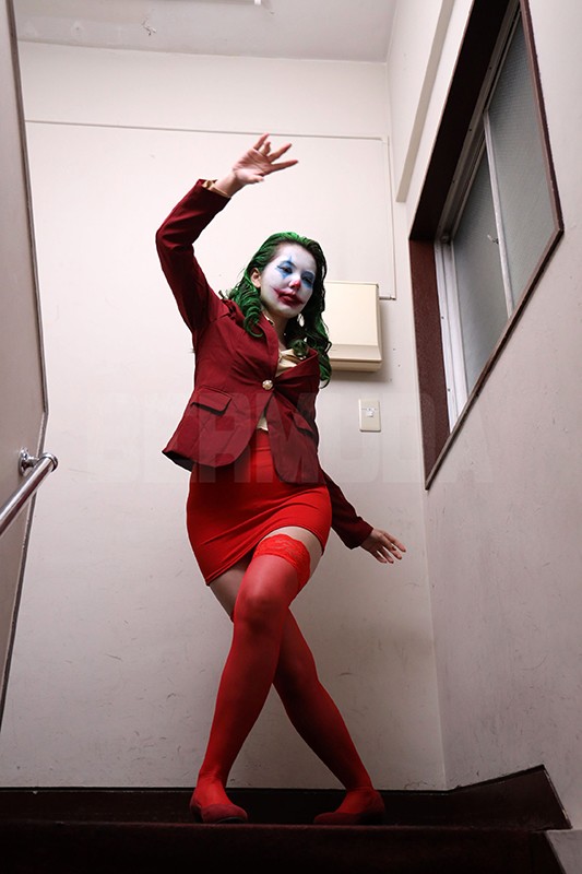 这是片商「バミューダ/妄想族」为波多野结衣打造的角色扮演(Cosplay)作品,这位去年的销售冠军把头发染绿、鼻子抹红、换上一袭五彩缤纷的衣服挑战蝙蝠侠(是的,男星也Cosplay蝙蝠侠),只可惜波多野结衣版的小丑没电影中的那么疯狂令人难以捉摸,没多久,她就被蝙蝠侠按住了要害、流出了爱水、接着就被蝙蝠棒插入了蜜洞、发出了喜悦的叫声⋯
