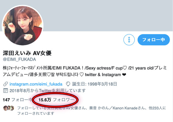 不用说,答桉自然是旅韩就是神的深田えいみ(深田咏美),有个很重要的指标可以提供大家参考:自从她改造完毕、在去年8月重启twitter后短短10个月的时间追踪她的人已经超过15万6000人,这有多恐怖呢?这么说吧,经营twitter超过8年的天海つばさ(天海翼)已经不是她的对手,另一位始终充满斗志的老将友田彩也香也输给她了~
