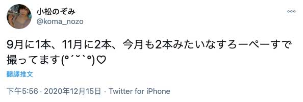 所以答案出来了,这位脸蛋卡娃依又有一对G乃还超级M的短发妹子就是新人「小松のぞみ(小松希望)」,至于她有没有像石原希望那么有希望呢?她自己也在twitter讲了,她9月拍了1片、11月拍了2片、这个月也拍了2片⋯