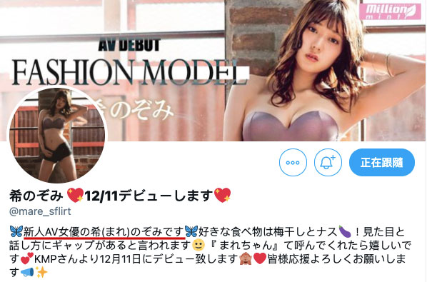 这是一个在名字上搞怪的新人,希这个字一般日本人会读做「Nozomi」,而这正也是她的名「のぞみ」的读音,所以不知道的人会以为她的名和她的姓读音一模一样要连唸两次Nozomi;但其实不是,她的姓「希」是用另一个读音「まれ(Mare)」,所以她要在Twitter的自我介绍栏上特别注明「希(まれ)のぞみ」,希望用这种名字搞怪的方式让大家记住自己⋯