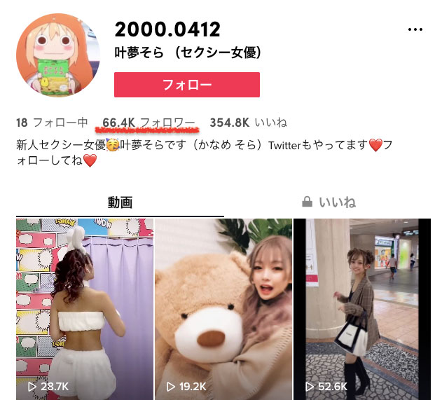 有多红呢?封面写得很清楚,她的TikTok抖音帐号有接近10万人追踪,我稍微查了一下,叶梦そら(叶梦空)的帐号(tiktok.com/@2000.0412)有超过6.6万人追踪,虽然不及于二阶堂梦但也是很不错的数字了,说她是个网红大致上是没错啦⋯