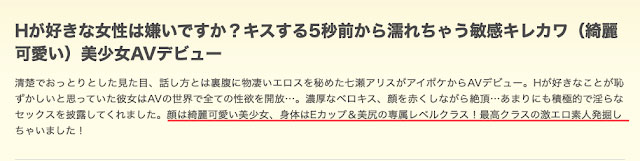 这中间的决策过程我不是很明白,毕竟每个女星有自己的需求、事务所也有他们的策略,但是七瀬アリス(七濑爱丽丝)的状况是连片商都在文案告诉大家「有专属的水准」,因为她脸蛋是绮丽的美少女、身体是E罩杯的美球配上小而翘的美尻⋯可能是因为片商自己也太难理解一个该去金州勇士队打球的好手为什么要跑来打富邦勇士,所以最后只好给七瀬アリス(七濑爱丽丝)封了个「最高クラスの激エロ素人(最高等级的超强好色素人」的称号交代过去⋯