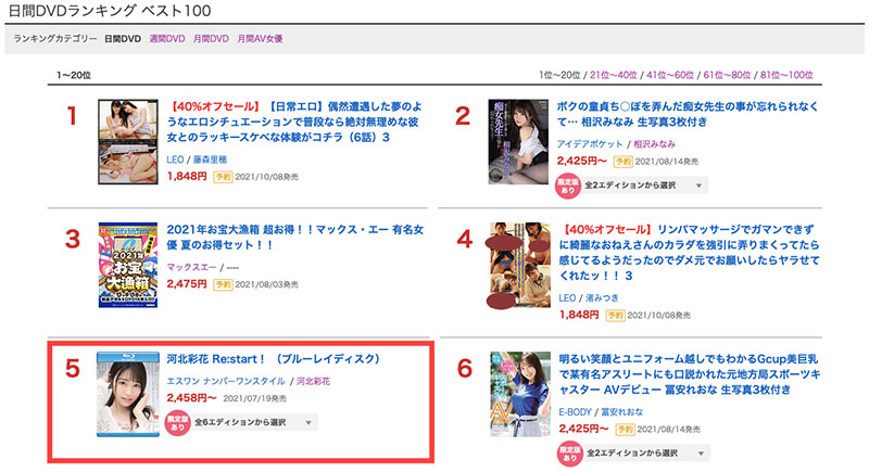 不过硬件条件还是非常棒啦,而且之前6支作品累积的神秘感一次爆发,在S1以顶天规格行销后她不只twitter追踪迅速破了4万,作品销售更是把所有女星按在地上摩擦ー直到昨天她的回归作“河北彩花 Re:start!”在FANZA通贩的日间排行榜仍然高居第五,这成绩应该会让很多女星气得跳脚〜