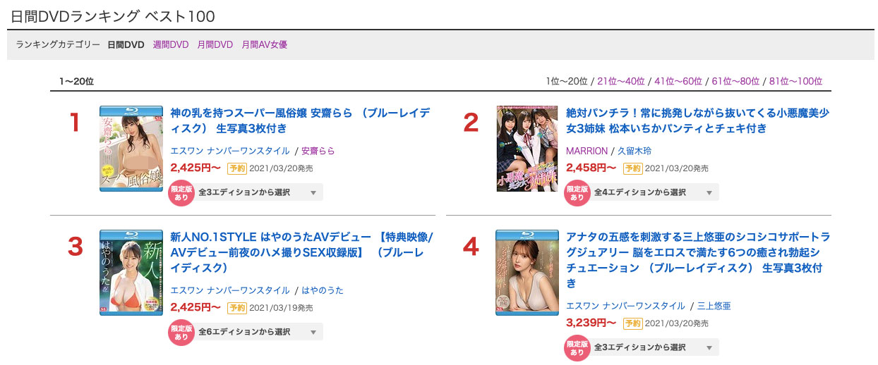 看今天的销售排行销售榜就知道了,不出所料,安斋らら(安斋拉拉)拿下了单日销售排行榜冠军(蓝光版)以及第20名;一个人用两个番号出道的新人はやのうた(早野诗)则是拿下了第3和第8名,可说有个好的开始;但别忘了S1还有个八风吹不动的超级王牌“三上悠亜”,就算神球回归就算超级新人出道,她的最新作“アナタの五感を刺激する三上悠亜のシコシコサポートラグジュアリー 脳をエロスで満たす6つの愈され勃起シチュエーション”力守住排行榜第四?