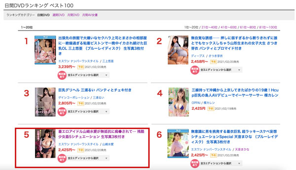 坦白说,她是有可能6支作品就不见的,因为她没有twitter和IG,这种女星向来不能保证待多久,像河北彩花这么杀也就是6片;但如果你说S1是用「踢」的请她走那是绝对不正确,因为身为S1到目前为止的最后一位新人(2020.12~2021.2这片商都没有新人),写真资历丰富的她打从一出道到现在都很卖,不只修改过的2020年销售排行榜把她的出道作列为第一,最新的作品「着エロアイドル山崎水爱が无抵抗に痴汉されて… 残酷少女姦5シチュエーション」在上架的前两天也通通进入单日销售排行的前10名,在S1只输三上,厉害的呢。