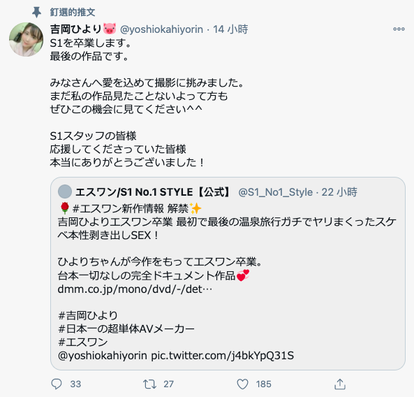 但我还是要再强调一次,S1这地方不好待,再加上所有女星自出道就是在为了引退做准备,离开只是早晚的问题。只是吉冈这一走倒是浮现了些问题,先是乃木蛍、再来是新名あみん(新名爱明),在月岛かのん(月岛花音)后又是吉冈ひより(吉冈日和)离开,S1现在的麻烦是在山崎水爱之后已经连续3个月没有补充新人,然后这4位女星一走现在专属女星「只剩」22个,人愈来愈少不说还没有新鲜的肉体⋯