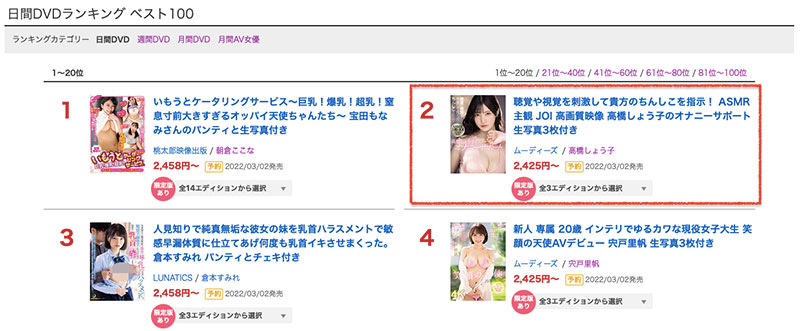 还好,虽然没有拿下昨天的第一,但至少还是第二,也还OK,而随着2022年的到来,相信大家都看到高桥所属的片商Moodyz近来是专属女星连发,从“新一代美少女”石川澪开始、包括“一万人追踪就出道”花芽ありす(花芽有朱)、“神球”明日见未来、“写真明星”三田サクラ(三田樱)、“只被插入0.5公分”的佐久良咲希以及才刚出道宍戸里帆个个都是强者,这也让人不禁担心是否高桥しょう子(高桥圣子)共主的地位不再?