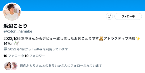 身为本中在2022年推出的新人,浜辺ことり(滨边小鸟)是蛮特别的一位,你说她不重要嘛还真不重要,因为4位新人只有她在首页没有Banner,但和其他同时出道的女星她却好像又有点重要,因为她是有twitter、有亮出事务所招牌的新人: