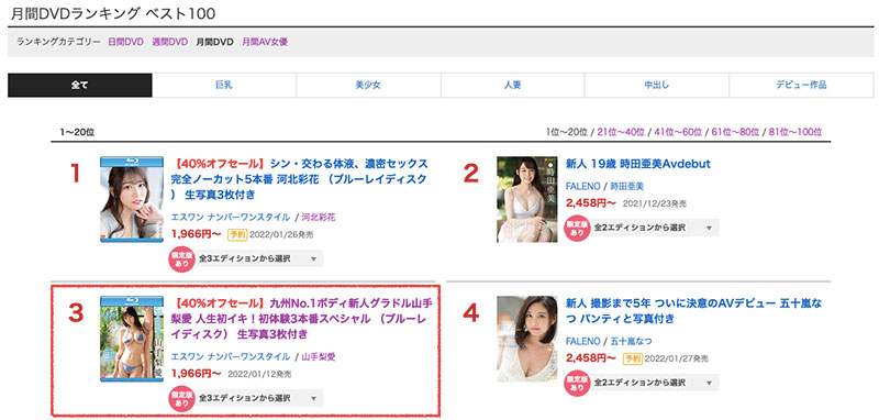 虽然是S1新人必经的第三片,但因为女星是“山手梨爱”而有所不同:因为她不是一般的新人,虽然因为接种疫苗发烧导致第2支作品迟到,但她的作品“九州No.1ボディ新人グラドル山手梨爱 人生初イキ!初体験3本番スペシャル ”拿下了FANZA销售排行榜的第3名,只输给了河北彩花和时田亜美;另外,10月才启动twitter的她人气强强滚,不只出道作在FANZA的按赞数破五万,twitter追踪更是直逼七万大关,简单说,就是四个字,超・级・新・人!