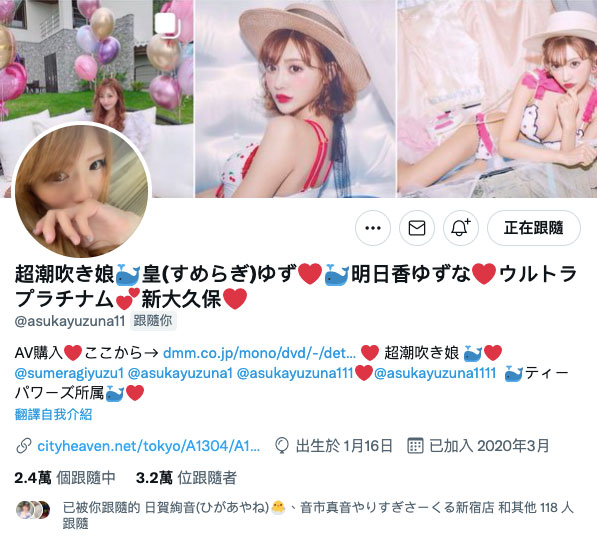 你是不是想起来了?还是没印象也没关系,在去年3月的时候,她同时在twitter注册了两个账号@asukayuzuna1以及@asukayuzuna11,靠着明日花キララ(明日花绮罗)很像的名字、各种花式潮吹不输坂道みる(坂道美琉)的夸张影片以及你追我我就追回来的方式迅速累积粉丝;另外,用明日香ゆずな(明日香柚奈)的名字丢Google就可以发现她不但在FC2有各式各样的风俗体验影片,还在Tokyo Motion有无马影片⋯
