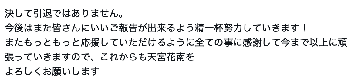 这就不用去检讨她哪里做不好了,做不好不会待到三年半;但就如前面说的,她不但带动了「丧女」的风潮而且得到的待遇非常好,我真的没想到只做到今年为止,我以为还可以继续下去的ー至于下一步呢?天宫花南斩钉截铁地说了,绝对不会引退,她会继续努力希望很快能告诉大家好消息,希望大家能继续支持她!