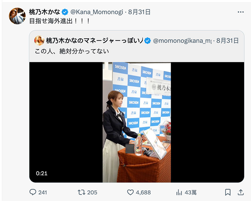 最后稍微提一下,不久前在写真集的见面会时,因为碰到讲英文的粉丝时所以双方一阵鸡同鸭讲后她在X()上发文说目标是到海外发展(目指せ海外进出!!!)ー正好,最近又有厂商想找她合作,就希望这次能合作成功吧〜