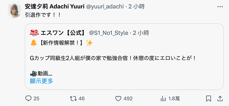 她自己在X()说了,这支共演就是引退作,所以也可以确定了,她引退不是有计划的行为,就是拍完这支作品后不干了,所以才会用这种共演作的方式和大家说再见;虽然安达没有引退作让人有点遗憾,不过这支作品还是很有意义的,因为它同时夺走了安达和宇野两位女星的第一次ー是的,两位女星都是第一次参与共演的企划,能和她们共演的男星真是太爽了〜
