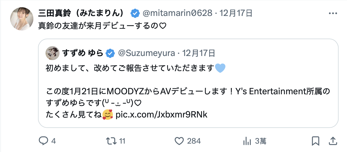 是「三田真铃」,她在X转推すずめゆら(铃芽由罗)的发文(),说两人是好友〜