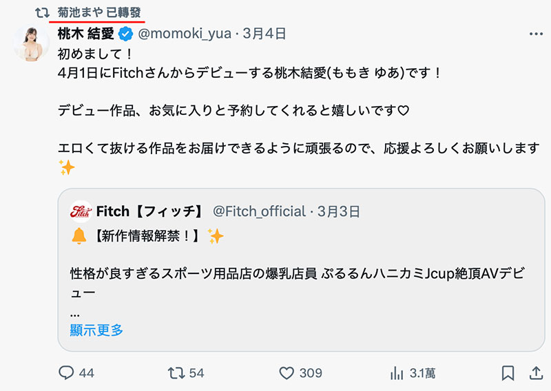 可是、有一个很大的可是、请大家看看桃木结爱在社群上的发文,有一个很有趣的转推: