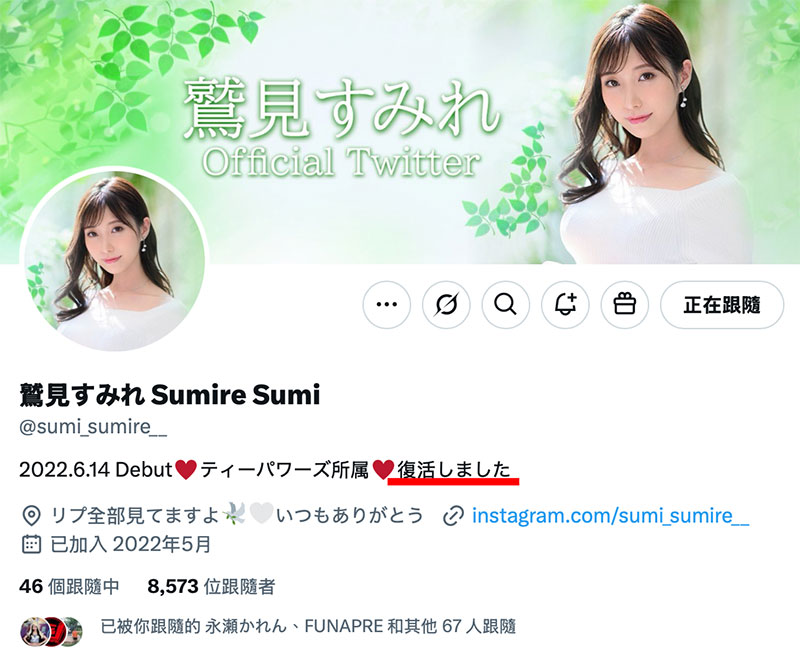 去年年中,好久不见的鹫见すみれ(鹫见蓳)开始更新社群,也在红龙(レッドドラゴン,Red Dragon)陪酒,逐步向完全复活的方向走;到了去年9月,她正式在社群告诉大家自己在摄影了,虽然更新的速度还是很慢,但已经可以期待她全新拍摄的A片上架了: